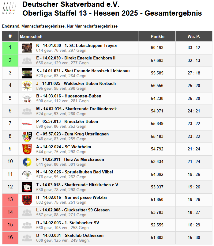 Nach dem Saisonfinale steht die Mannschaft der Sprudelbuben mit 19:26 Punkten auf Rang 11. Klassenerhalt gesichert.